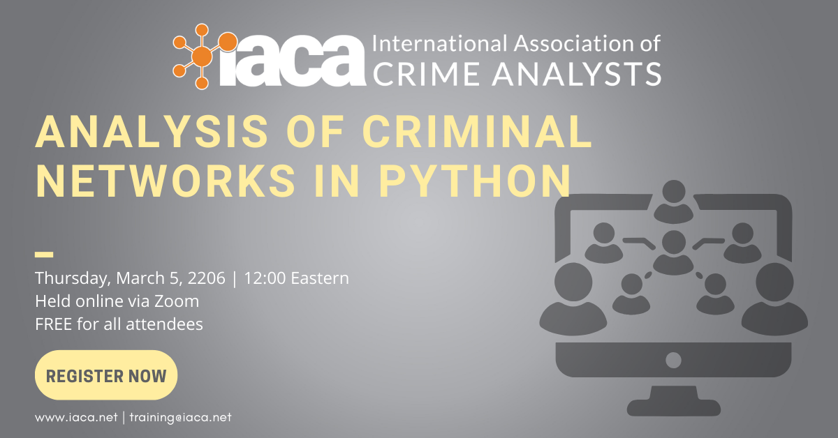 This webinar introduces criminal network analysis using Python, focusing on co-offending networks derived from police data. Participants will follow the analytical workflow, from raw police data to the construction and analysis of a social network of co-offenders. The aim is to demonstrate how routinely collected police records can be transformed into network representations that reveal how offenders are connected through shared criminal activity. The webinar then focuses on individual-level analysis, illustrating how to identify prolific and structurally important offenders. Ego-centric networks are extracted to examine the immediate criminal environment of selected individuals. Centrality measures are introduced and interpreted to assess which actors occupy key structural positions, including potential brokers between groups and individuals who may be particularly relevant for network disruption strategies. Additionally, the webinar introduces the concept of multilayer networks to illustrate how different types of relationships or interactions can be modeled and analyzed. In addition to network analysis, the webinar highlights practical data manipulation techniques in Python that are commonly required when working with police data. All examples are implemented using open-source Python libraries, including Pandas for data manipulation, NetworkX for network construction and analysis, and PyViz for network visualization. No prior knowledge of social network analysis or Python programming is required, although familiarity with data analysis concepts may be advantageous. All registrants who are IACA members will receive Continuing Education Credits and you may request a certificate if you want one. If you have questions about the webinar program, please view our FAQs page or email [email protected].